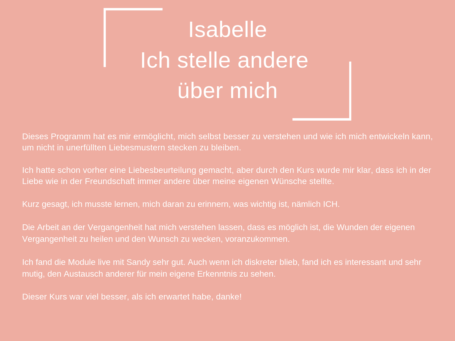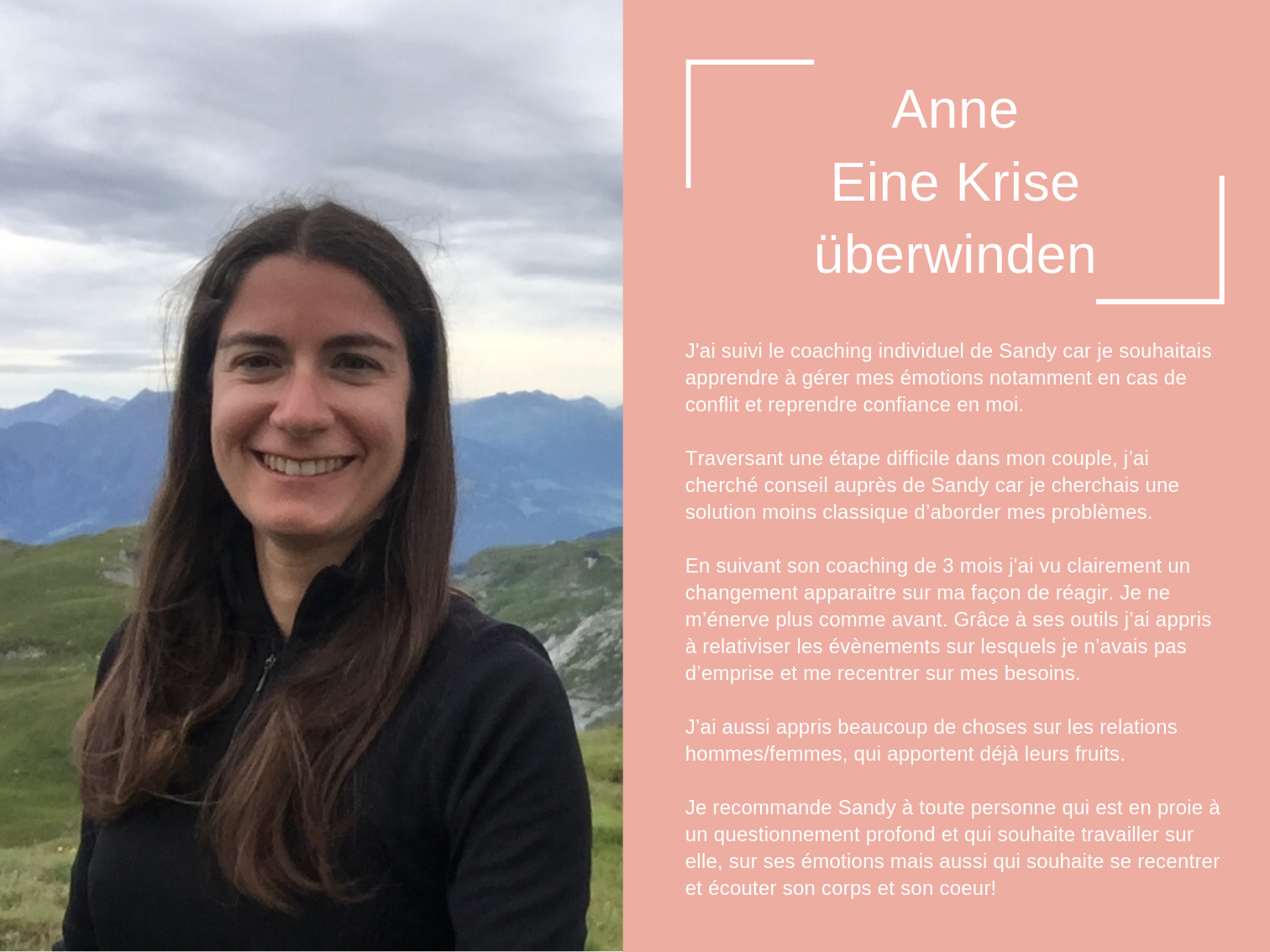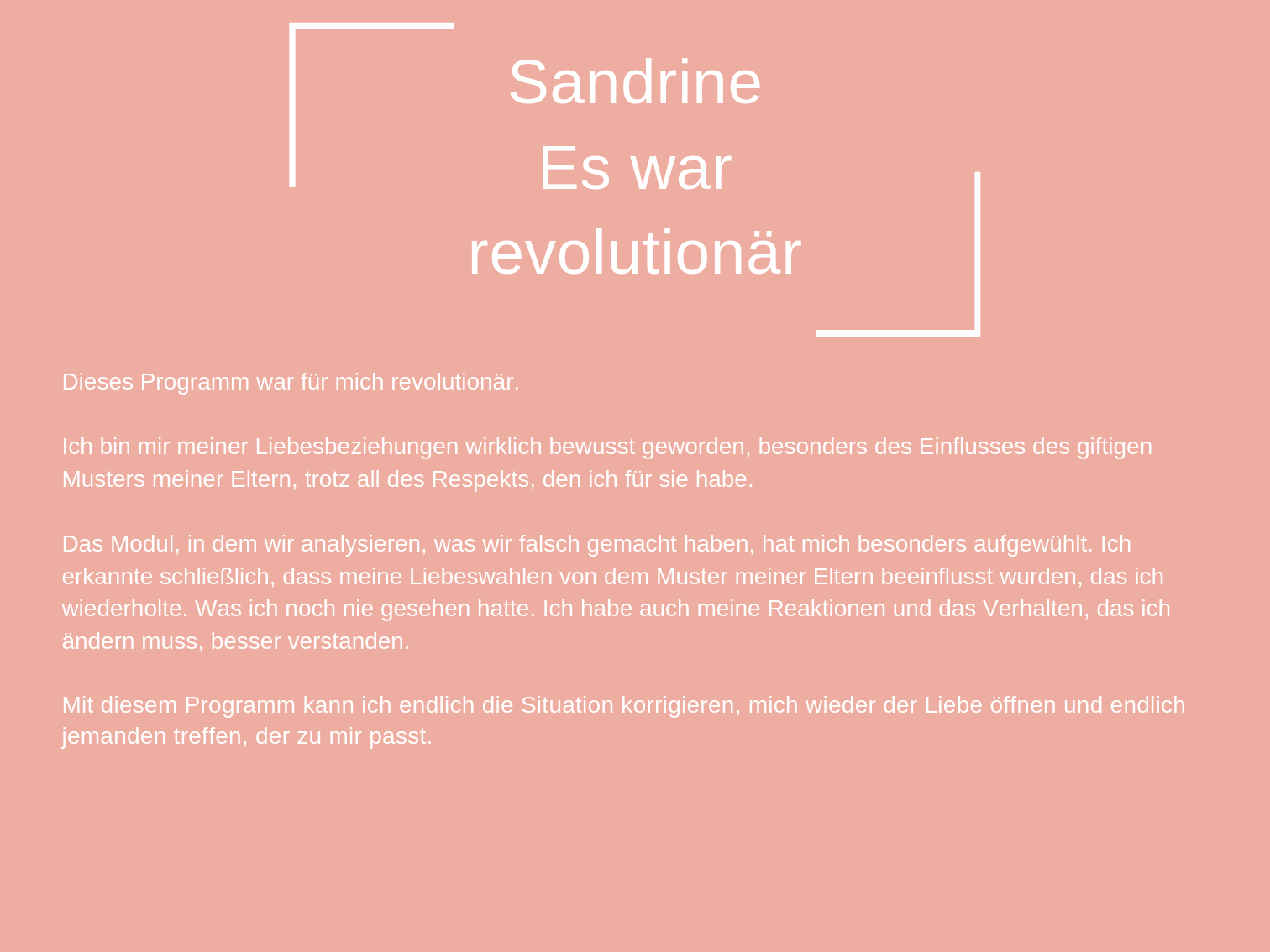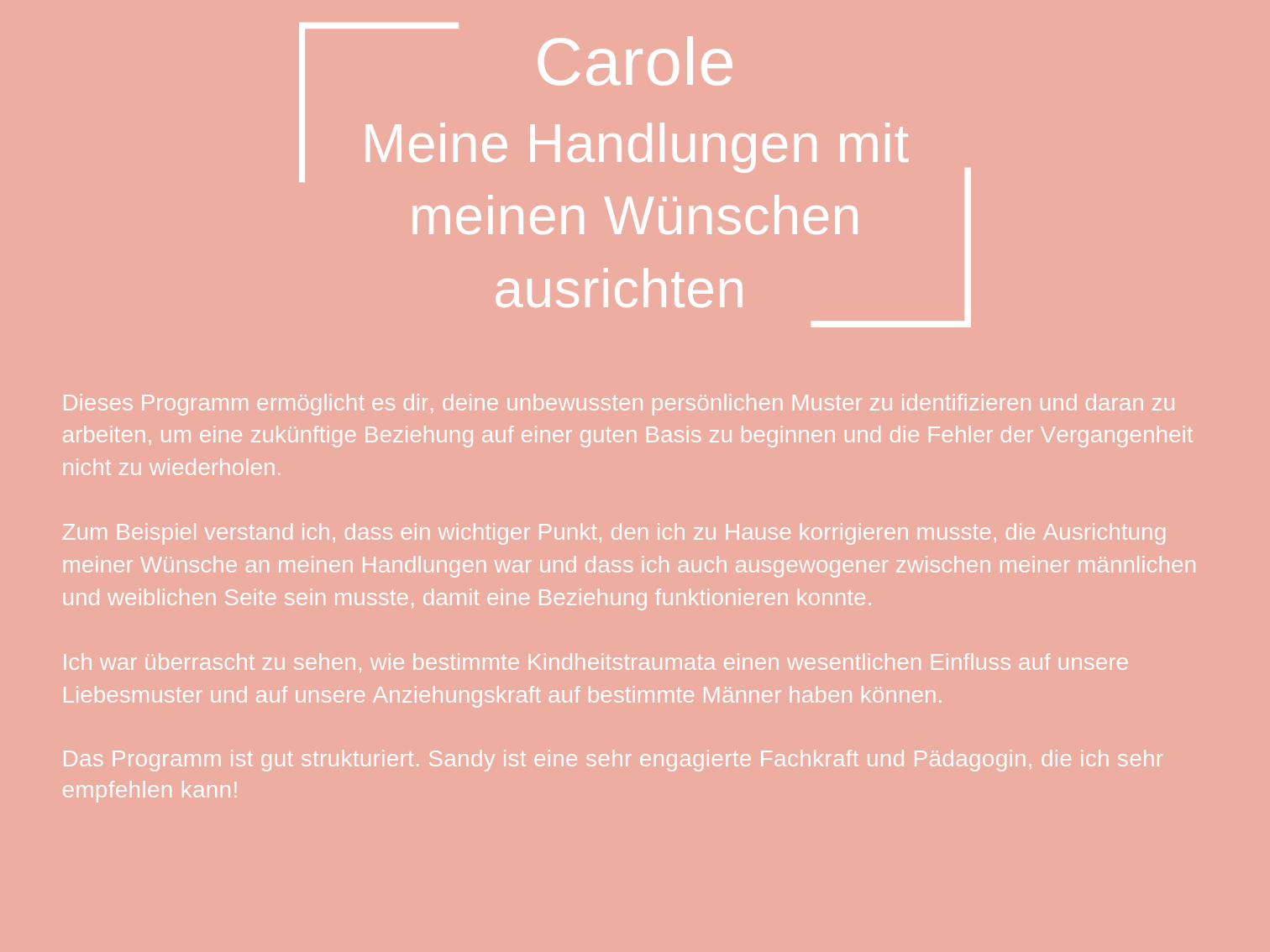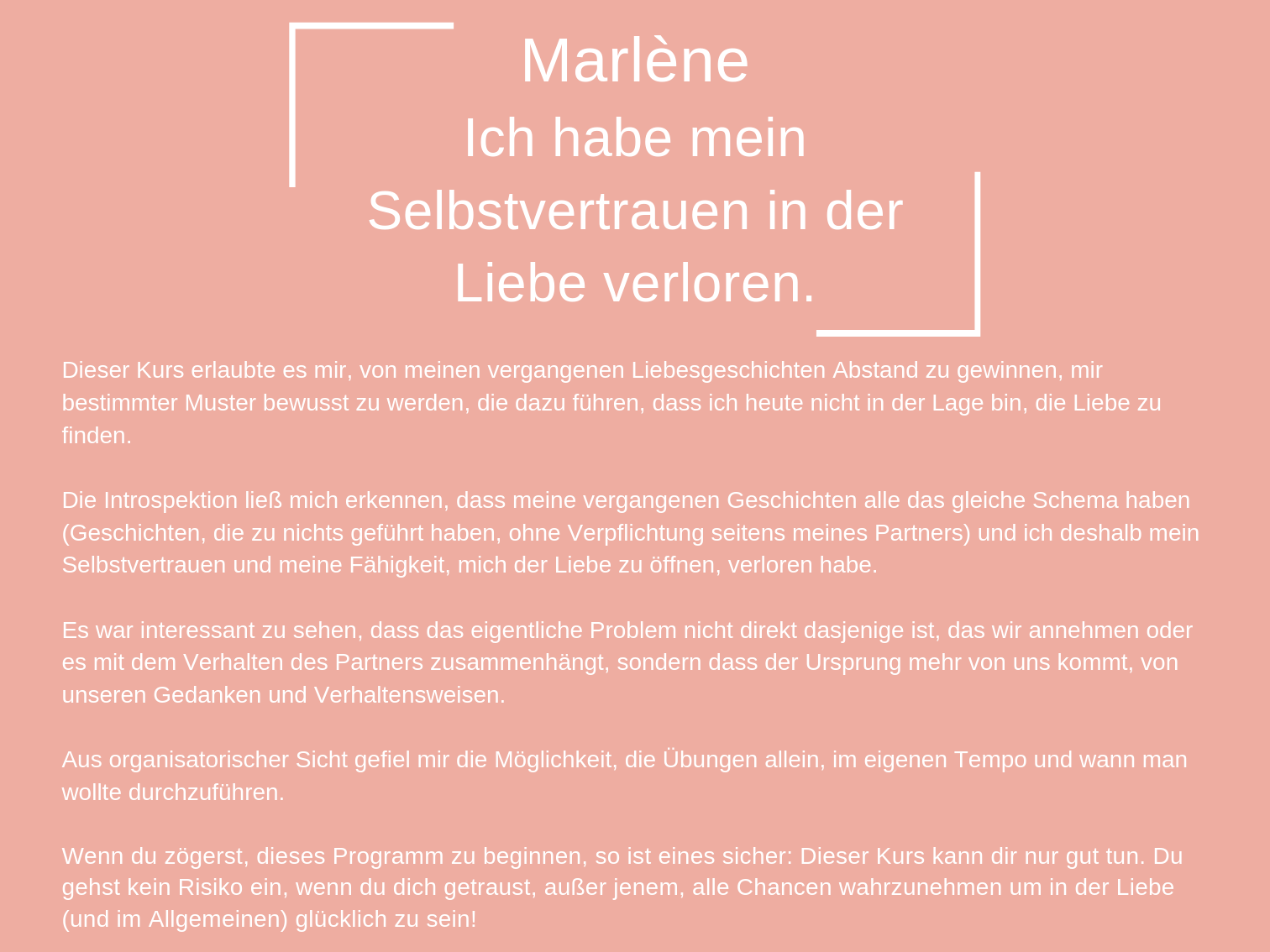 Das Coaching, das ich heute anbiete, besteht aus all den Werkzeugen, die mir persönlich geholfen haben, mich selbst zu heilen und in der Liebe glücklich zu sein.