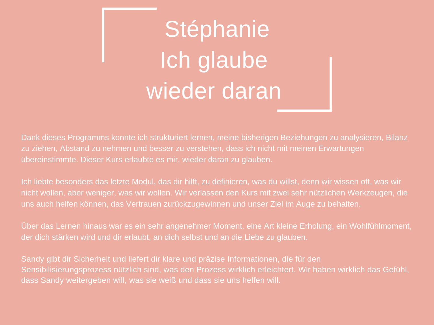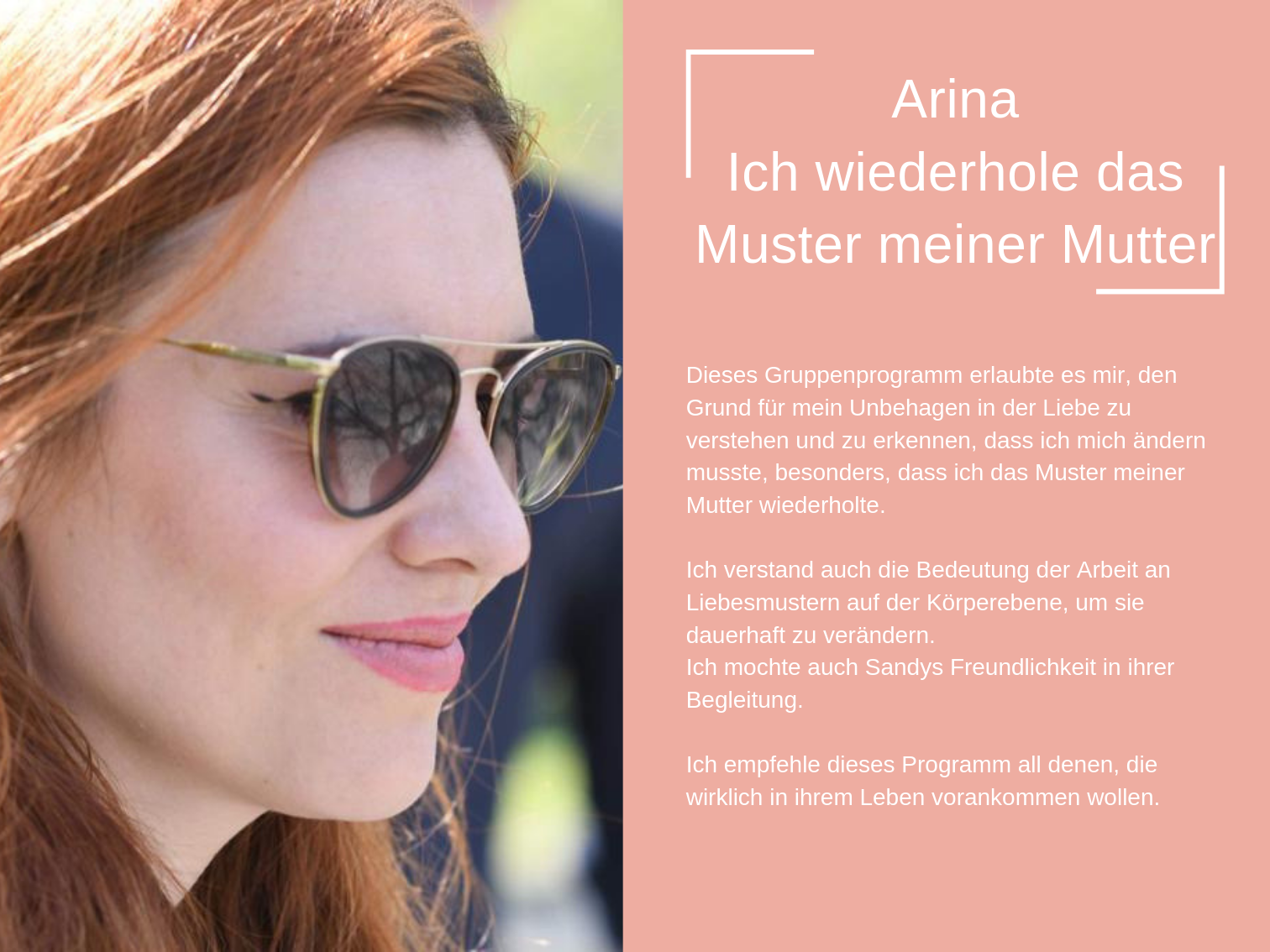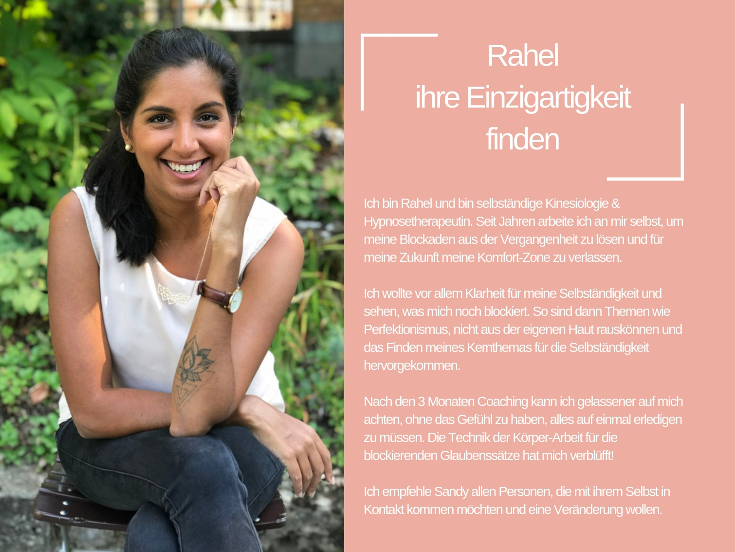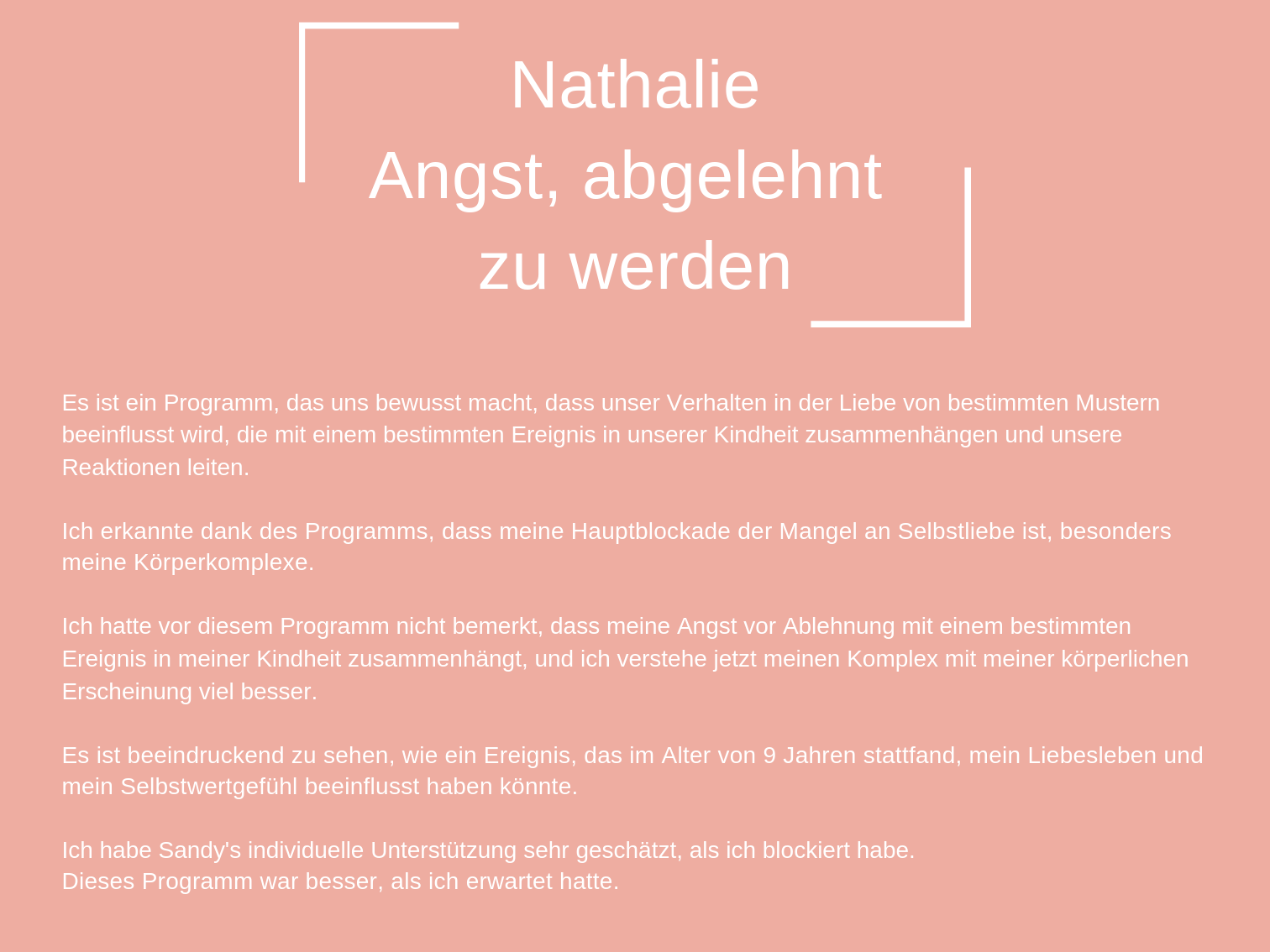 Das Coaching, das ich heute anbiete, besteht aus all den Werkzeugen, die mir persönlich geholfen haben, mich selbst zu heilen und in der Liebe glücklich zu sein.