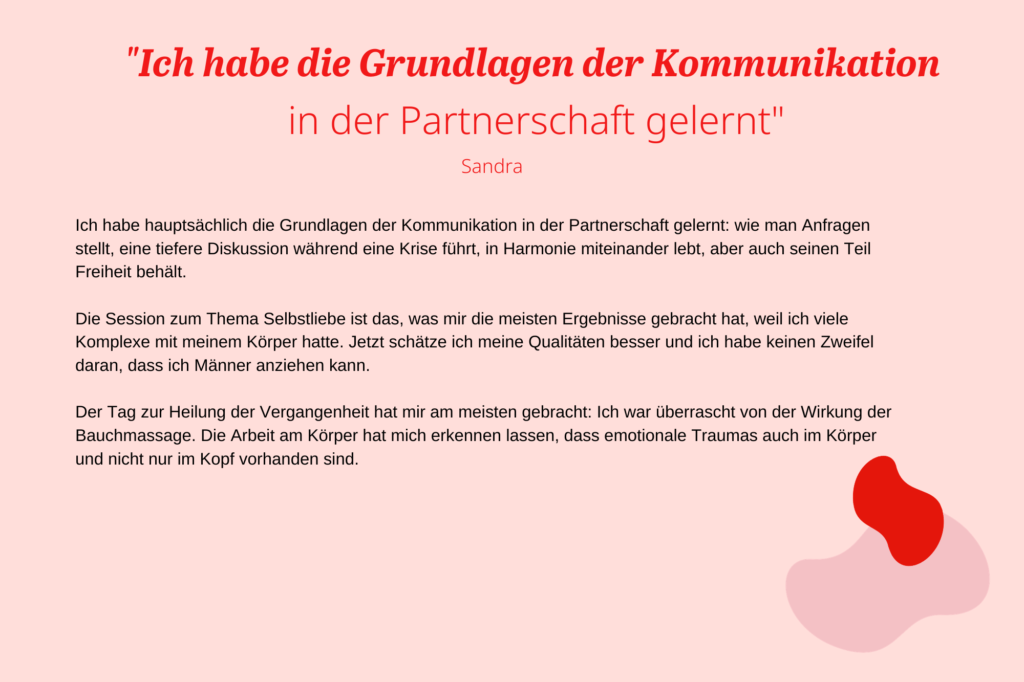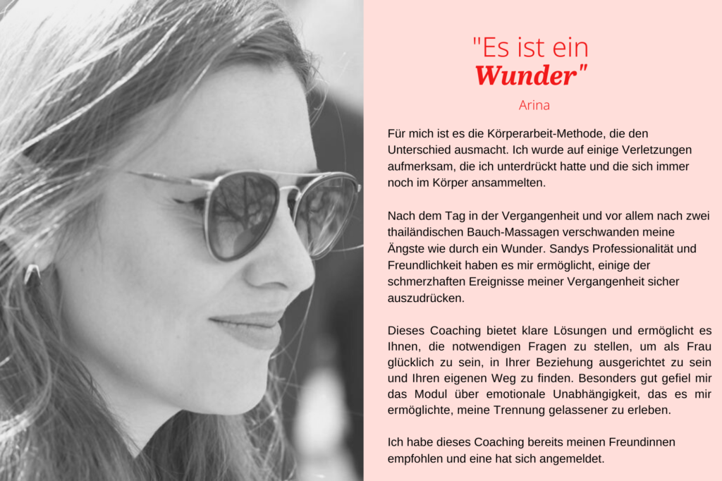 - Um das Vertrauen in dich selbst zurückzugewinnen, dich deines Wertes bewusst zu werden, dich mit deiner Weiblichkeit und deiner weiblichen Kraft zu versöhnen.