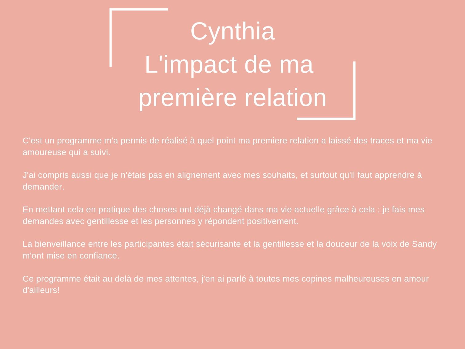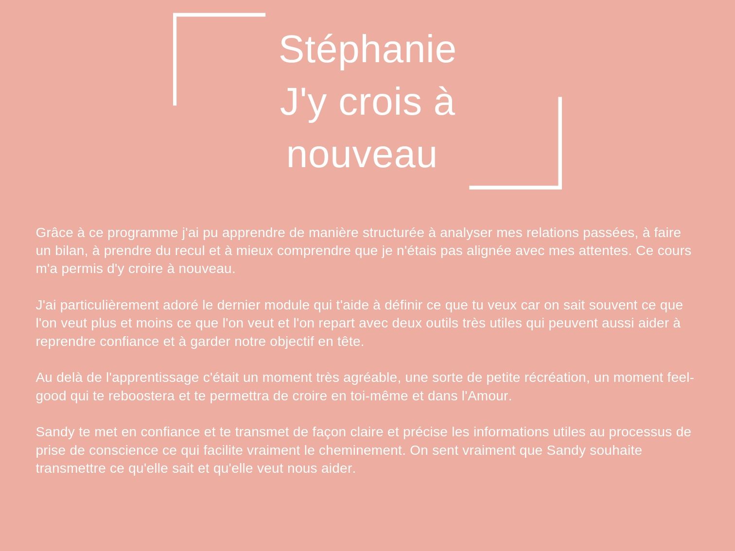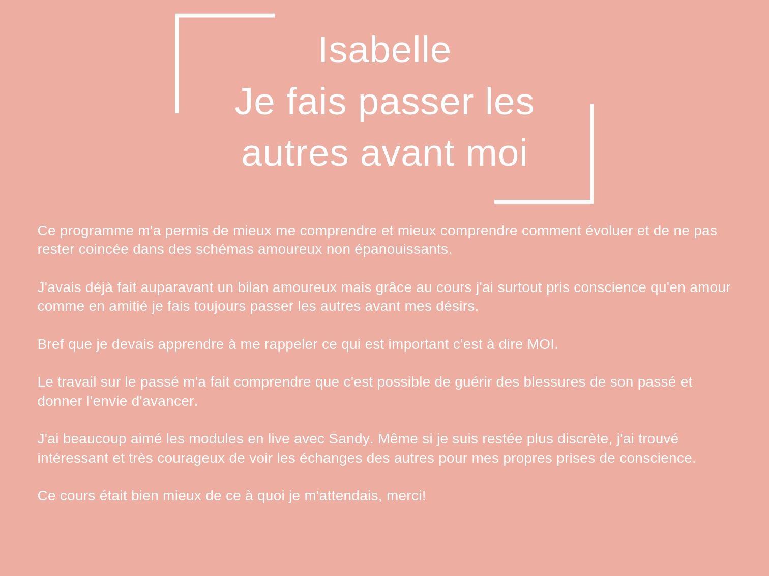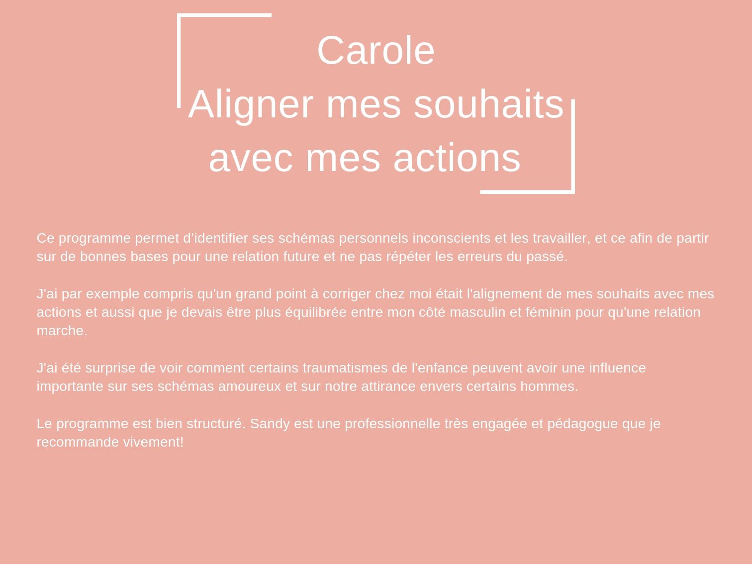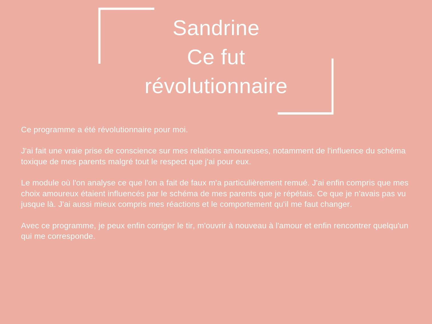 Le coaching que je propose aujourd’hui se compose de tous les outils qui m’ont personnellement aidée à me guérir et à être heureuse en Amour.