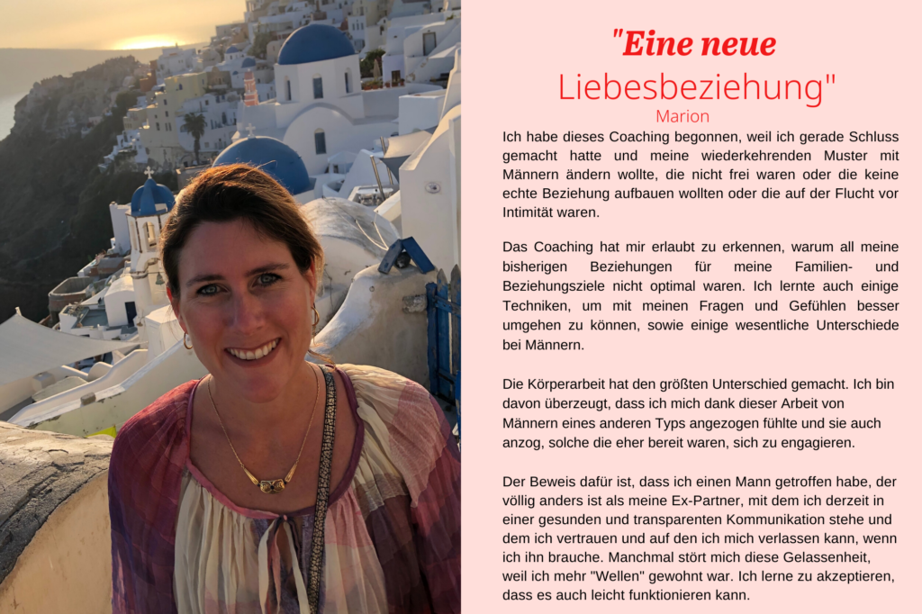 - Tag der Vergangenheit: 1 VIP-Intensivtag in Zürich oder Lausanne, um mit dem psycho-körperliche Ansatz an deiner Vergangenheit zu arbeiten und deine Liebesmuster zu verändern.