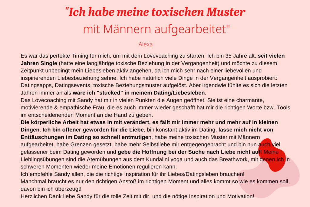 Heute habe ich mein Selbstvertrauen zurückgewonnen, ich denke wieder an mich selbst, ich fühle mich stark und zuversichtlich. Ich bin offen für eine neue Liebesbeziehung und bin sicher, dass ich auf dem richtigen Weg bin und die Person treffen werde, die zu mir passt und die ich brauche.